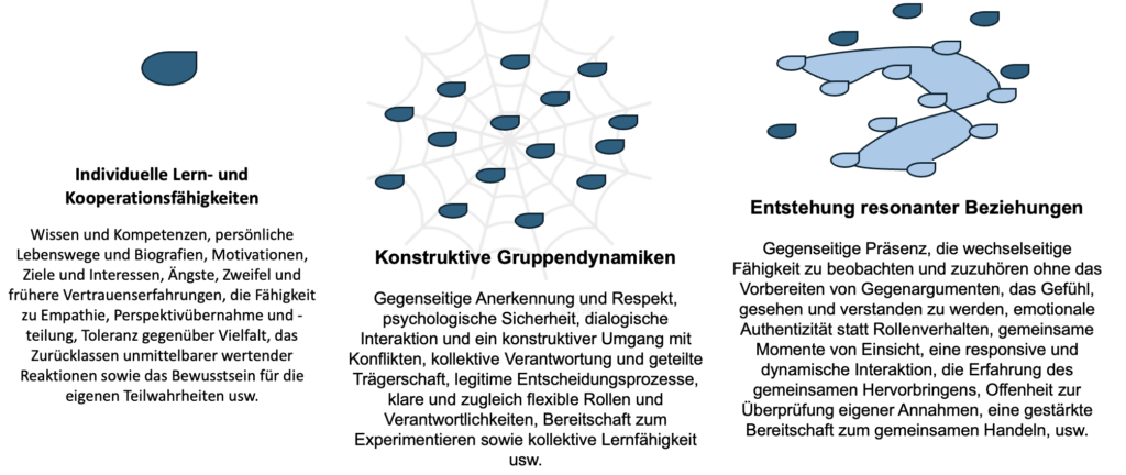 Graphik 1: Individuelle und kollektive Merkmale, die positive Gruppendynamiken und das Entstehen von Resonanz in sozialen und ökonomischen Veränderungsprozessen prägen.